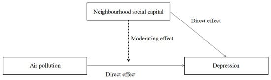 Although earnest efforts have been adopted to investigate the relationship between air pollution and depressive symptoms in developed countries, the relationship is still unclear in developing countries, such as China. Furthermore, although there is a consensus that neighbourhood social capital is beneficial for mental health, its protective benefits in the relationship between depressive symptoms and air pollution is still unclear. To bridge these gaps, this study investigated the relationship between PM2.5 concentrations and depressive symptoms in China using data from the 2016 wave of the China Labourforce Dynamics Survey (CLDS 2016). We further examine whether neighbourhood social capital has a protective influence on the relationship between depressive symptoms and PM2.5 concentrations. This study contributes to the body of literature in two respects: first, it improves our understanding of how air pollution negatively influences people’s mental health in China; and, second, it provides a deeper understanding of the protective function of neighbourhood social capital for mental health. The conceptual model is presented in Figure 1.