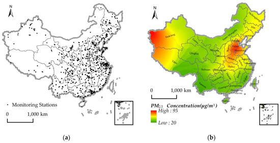 Average annual PM2.5 concentrations of each prefecture were acquired from a real-time remote inquiry website—Airborne Fine Particulate Matter and Air Quality Index []—which provides a quantitative hourly index of air pollutants such as AQI, CO, NO2, SO2, O3, PM10, and PM2.5. By calling the API of the website, the AQI observation data from January to December 2015 in 1613 monitoring stations were collected and cleaned. However, there was a lot of missing data and noise in the observation data. Therefore, a Kalman filter was used for the optimal estimate of PM2.5 observation values []. A Kalman filter is a time-domain filtering algorithm, which can obtain the optimal estimation of the next moment based on the state of the system and the observation value at the next moment []. Another problem was that the recorded data had neither longitude nor latitude information, which may make it difficult to represent spatial variation. To map the data into a geographical space, geocoding was used to associate the observation data with spatial coordinates. Figure 2a shows the locations of 1613 monitoring stations in China in 373 cities. Further, the ordinary kriging interpolation method was used to generate a continuous raster surface (pixel size = 500 m), and zonal statistics was applied to extract the mean concentrations of PM2.5 in each prefecture. Figure 2b shows the spatial interpolation of the average PM2.5 concentration in 2015, which was obtained by applying the Kriging method to the ground-based observations average in 2015.