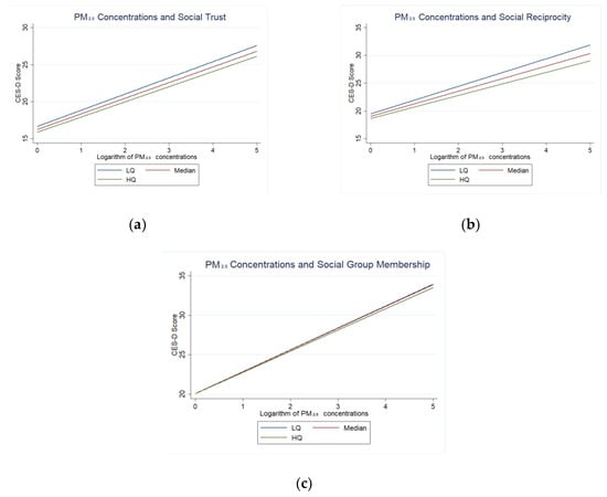 (a) Predicted relationship between PM2.5 concentrations and CES-D scores differing by social trust; (b) Predicted relationship between PM2.5 concentrations and CES-D scores differing by social reciprocity; (c) Predicted relationship between PM2.5 concentrations and CES-D scores differing by social group membership.Lower Quartile (LQ = 25%), the median (MQ = 50%) and higher quartile (HQ = 75%).