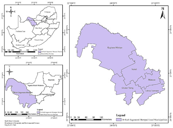The study area was Vryburg District, a municipal district found in the North West Province of South Africa. The area is located between 25°16′ S–28°6′ S and 22°38′ E–26°14′ E (Figure 1). The district is semi-arid and records a mean annual rainfall of around 410 mm. The area experiences summer rainfalls mainly from October to March, sometimes extending to April in the following year. The mean day temperature in summer is 33 °C and night temperature 18 °C. Winter is cool, with the mean night temperature sometimes being below 0 °C and that of the day reaching 19 °C. The relative humidity is between 64 and 66% in February and about 28–32% in July. Frost occurrence is a regular feature, appearing on between 31 and 60 days in winter. Also, the rate of evaporation exceeds that of precipitation in the district. The dominant biome is grassland savannah consisting of Kalahari Thornveld and Bushveld shrub vegetation [13]. The vegetation is of poor quality. Therefore, the majority of the area is used for grazing cattle, sheep, and goats, except for the Taung Irrigation Scheme that produces field crops. Agriculture is regarded as the major land use with mixed crop farming including barley, wheat, sunflower, maize, cotton, and nuts.