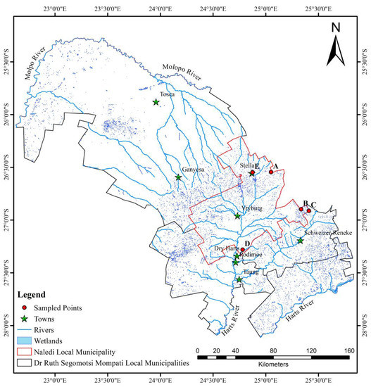 Most rural communities in South Africa experience serious water shortages due to low rainfall and high evapotranspiration rates. The study area, the Vryburg District in the North West province of South Africa, is a semi-arid area. Ephemeral ponds are small, isolated deep depressions that only fill up during the short rainfall events. They are water bodies that occupy depressions in the local terrain and are associated with impeded drainage. These ponds form part of the wetlands in general, including other water bodies such as the vernal ponds, bogs, mangroves, temporary pools, and seasonal wetlands [12]. The ponds tend to be short-lived but there is no scientific agreement as to when alternative terms should apply. However, for the purposes of this study, a cut-off date of six months is hereby proposed. These ephemeral ponds are characterised by variability in location, surface area, longevity, water quality, volume of water stored, and mean depth. The longevity of these ponds varies between a few days to several months, depending on some of the parameters mentioned earlier. Much of the water is lost through high temperatures that cause high evaporation rates. In addition, natural seepage into groundwater adds to water loss. These ponds are essentially short-lived water reservoirs located in semi-arid areas, where the potential for irrigation farming has so far not been assessed. Due to the short retention capacity of the ponds, they could be possibly used for small-scale agriculture such as such the growing of vegetables and field crops (maize, peanut and soybeans). The hypothesis for this study was that the use of ephemeral pond water for irrigation would significantly improve and raise the level of production, and consequently the livelihood outcomes, which cannot be in isolation of the other livelihood assets. The aim of the study was, therefore, to explore the dynamics of ephemeral ponds in relation to land-use in the surrounding vicinity in order to analyse their potential for improving small-scale irrigation. The primary objectives were (1) to assess the water quality of ephemeral ponds in Vryburg District; (2) to investigate the land use change in the study area; and (3) to identify the relationship(s) between land use land cover change and water quality. In line with this, it was hypothesized that the use of ephemeral pond water for irrigation could significantly improve the level of production, and consequently, the livelihood outcomes of the adjacent local communities.