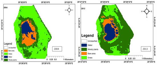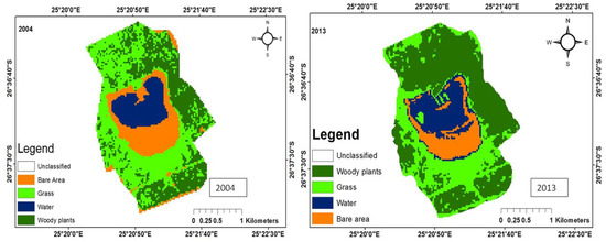 There were five main land uses: woody plants, grass, fresh water, build-up areas, and bare land. The woody trees, grass, fresh water, built-up areas, and bare soil land uses were shaded dark green, green, bluish colour, yellow, and brown, respectively. The woody plants in the study area consist predominantly of grass of the Kalahari Thornveld and shrubs of the Bushveld type. Grass comprises vegetation mainly for grazing. Water refers to ephemeral pond water, patches of water on the soil after rain and ephemeral streams that contain water during periods of high rainfall. Tracks, paths, areas exposed due to fire, over-grazing and parts of the pond that become dry due to low rainfall, evaporation and infiltration, constitute bare areas. Land use change maps for each of the ponds have been shown in Figure 3, Figure 4, Figure 5, Figure 6 and Figure 7, while the trends and statistics for each class are depicted in Table 3. On the basis of these results, trends in land use change are presented in percentage terms for the time period 2004–2013 for woody plants, grass cover, fresh water, bare ground, and built-up areas. However, these trends only apply to the individual pond-sub-catchments. It was not possible to extrapolate these results to report on trends for the entire study area.