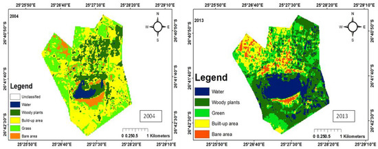 The increase in vegetation cover in 2013 could be attributed to the planting of trees, making of lawns and parks. These practices normally accompany urbanization and development, which started in the area after 2004 as evidenced by the increase in built-up area of 14.1% (Table 2). Since 2004, there has been an increase in the number of Rural Development Plan (RDP) houses in the area. The area covered by water decreased from 379.2 ha to 186.2 ha, which corresponds to the relatively high rainfall in 2004 in this part of the study area (342.8 mm) and the reduction in rainfall (288.2 mm) in 2013. The area created as a result of a reduction of in water was occupied by grass and woody plants.