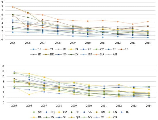 This study then uses the construction industry carbon intensity as the dependent variable, which includes panel data of China’s 30 provinces and municipalities from 2005 to 2014 (Hong Kong, Macao, Taiwan, and Tibet are not included due to a lack of data). The construction industry carbon intensity is defined as follows in Equation (5):