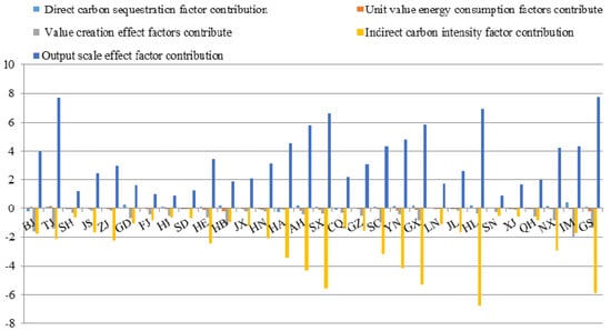 On the other hand, this factor’s contributions fluctuate from an average of 6 to 8 in the low-carbon provinces established by the state. These provinces, which include Hubei and Shaanxi, are located inland, and their technical levels and resource utilization are relatively low, factors that result in low carbon emissions efficiency. Therefore, the output of the scale effect of output of the construction industry source has a great influence in these provinces.