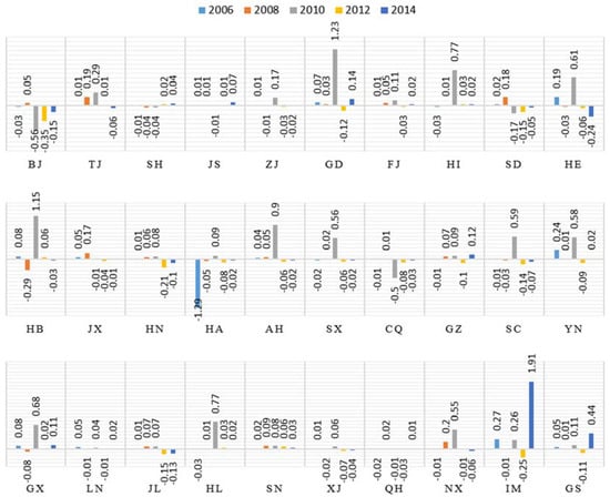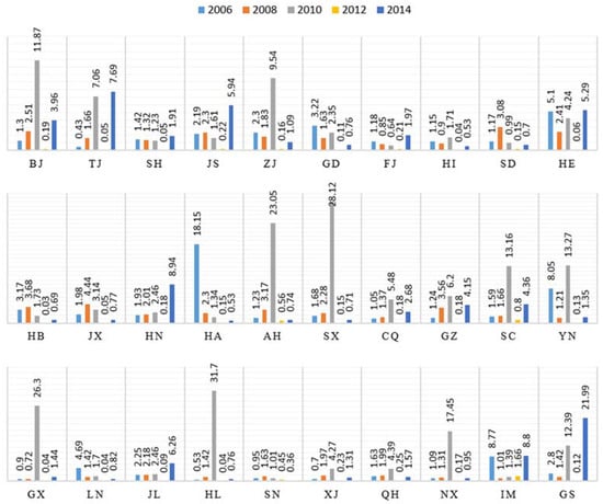 Contributions of direct energy proportion of 30 provinces in 2006, 2008, 2010, 2012 and 2014.
