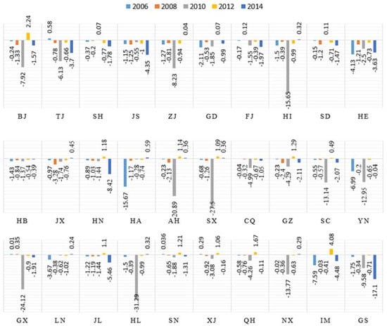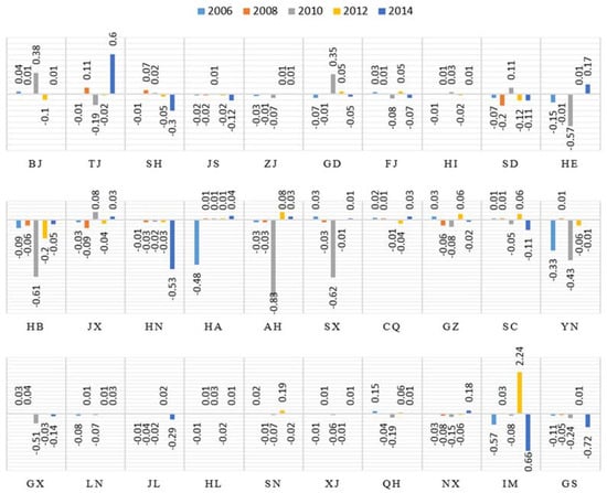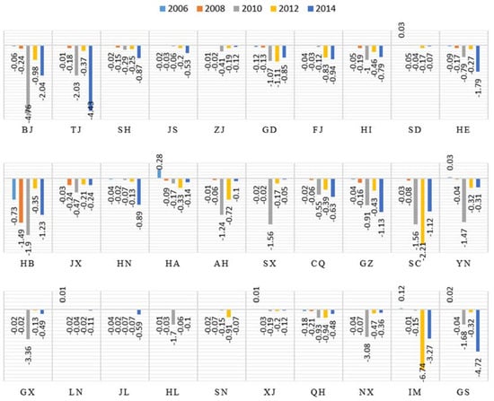 Regions where the contribution value was positive are located in the northeast and western areas, which include the provinces of Heilongjiang, Gansu, Fujian, Hunan, Guangxi and Shanxi. These provinces are characterized by relatively low technical levels and low levels of resource utilization, which, in turn, result in low carbon emissions efficiency. Accordingly, as the development leads to a reduction in carbon emissions, the contribution becomes negative. The primary contributions that reduce the carbon emissions were primarily concentrated in the eastern coastal areas, where the provinces are characterized by high levels of economic development, foreign capital utilization, population quality, energy efficiency and environmental management standards. Hence, these areas served as examples to surrounding areas be demonstrating how to control environmental problems and enhance carbon emissions efficiency.