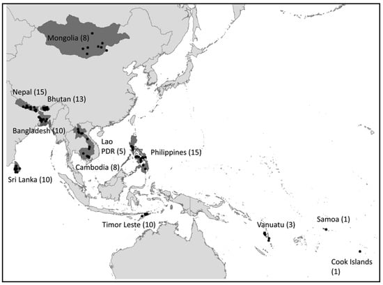 Written government approval for the study was obtained from Bangladesh, Cambodia, Lao PDR, Mongolia, Philippines, Sri Lanka, and Vanuatu. Government approval was implicit for Bhutan, Cook Islands, Nepal, Timor-Leste, and Samoa, where data collection was done by government agencies. The study protocol was submitted to the Western Institutional Review Board (WIRB, wirb.com, Olympia, WA, USA) for ethical review and received a determination of exemption from full review under 45 CFR §46.101(b)(2) of the Common Rule in the USA.