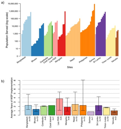 Piped systems represented 90% of the study sites (89 out of 99), with approximately two-thirds (58) of these operated by public/private utilities or local government units, and a third (31) managed by communities (Table 1). Point sources, representing 10% of the study sites (10 out of 99), included water-refilling stations and groundwater sources (Table 1). In most countries (all except Sri Lanka, Cook Islands, Samoa, and Vanuatu), sites represented a mix of rural and urban settings. Overall, 62% of the sites (61) were urban and 38% (38) were rural (Table 1). The populations served by the water systems varied widely between 22 people (a small community-managed piped system in Bhutan) to 8.9 million people (a large urban utility in the Philippines) (Figure 2a). The median population served across all the sites was 7140 people. Eight of the 10 smallest systems were in Bhutan; the 10 largest systems were in the Philippines, Mongolia, Sri Lanka, and Bangladesh (Figure 2a).