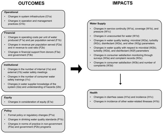 WHO developed an operational impact assessment framework for this study based on the CDC’s conceptual framework [], which distinguishes between shorter-term (occurring on the order of months) system-level changes, called “outcomes”, and longer-term (occurring on the order of years) service delivery and societal improvements, called “impacts” (Figure 3). Outcomes explored in the study include changes in communication and knowledge (institutional outcomes); infrastructure and operation/management procedures (operational outcomes); revenue collection, cost recovery, and investment (financial outcomes); norms and regulations (policy outcomes); and inclusion of disadvantaged groups (equity outcomes, which were added to the CDC conceptual framework) (Figure 3). Impacts include changes in water service delivery such as coverage, continuity, quality, and potential health impacts (e.g., reduction in waterborne illness) (Figure 3). Eventual socioeconomic changes (e.g., reductions in medical expenses and coping costs) included in the CDC conceptual framework were not considered in this study due to concerns related to the practicality of data collection and because these impacts are expected to occur over longer time scales.