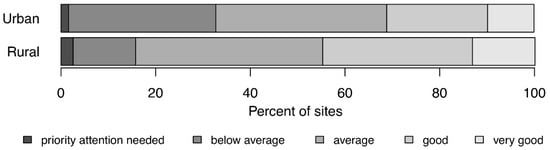 The WSP audit scores varied substantially between sites (Figure 4). No statistically significant relationships were found between audit scores and WSP age or population served (p > 0.05). The audit scores showed similar distributions for urban and rural sites, with the “average” category being the largest for both groups (Figure 4). The study generally did not find statistically significant relationships between audit scores and the outcomes or impacts measured. The absence of direct correlation between WSP implementation quality and outcomes/impacts suggests that WSP benefits result from a complex interplay of factors not limited to implementation rigor.
