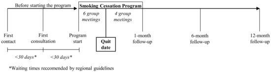 Several studies have demonstrated that socio-demographic characteristics and smoking behavior have a significant impact on smoking cessation. In particular, female gender, younger age [13,14,15], a lower education level or socioeconomic status [16,17,18], history of past or current psychiatric disorders [19,20], high level of nicotine dependence [21,22] and a lack of tobacco-related diseases [23] are associated with an increased risk of failure in quit attempts. In addition to smoker-related factors, SC service characteristics and organization may also influence smoking cessation. For example, timeliness in taking care of subjects who request tobacco-addiction treatment has been singled out [8,9,10,11], since smokers’ motivation to quit can change quickly, depending on the stage of change, as described by the so called “transtheoretical model” [24,25]. Nevertheless, the influence of waiting times during SC-programs and its impact on outcomes has been poorly evaluated to date. In addition, different types of referral sources to SC services have been assessed and showed contrasting results. For example, a higher cessation rate was found in self-referred subjects than for smokers referred from other sources [26]. In addition, another study highlighted better outcomes in subjects coming from general practitioners (GPs) than for self-referred subjects [27].
