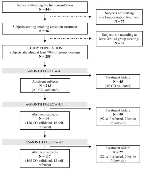 We designed a prospective cohort study, including subjects treated for smoking cessation between June 2011 and May 2013. We considered in the analyses only subjects attending at least 70% of the group meetings (7/10 meetings). Of all the subjects (444) who had a first contact with the SC service to plan a smoking cessation program, 288 (64.9%) were included in the study (Figure 2).