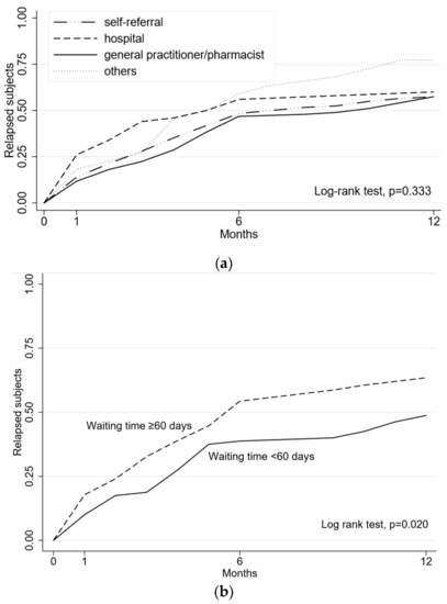 The majority of subjects (42.4%) had access to the SC service through self-referral, followed by 32.6% of subjects receiving GP/pharmacist advice, 17.4% referred from hospital and only 7.6% from other sources. These subjects were few in number, but they had the highest treatment failure rate at 12 months (77.3%). Participants referred by a GP/pharmacist failed in 60% of cases, those referred from a hospital failed in 57.5% of cases and self-referrals in 57.4% of cases. The Kaplan–Meier estimates and log-rank tests according to the referral source are presented in Figure 3a. Regarding waiting times, only 80 subjects (27.8%) were involved in the SC program within 60 days of the first contact, with a median waiting time of 81 days (range 2–218). Of these, 48.7% had treatment failure at 12 months, compared with 63.5% among subjects waiting ≥ 60 days. The Kaplan–Meier estimates and log-rank tests according to the waiting times are presented in Figure 3b.