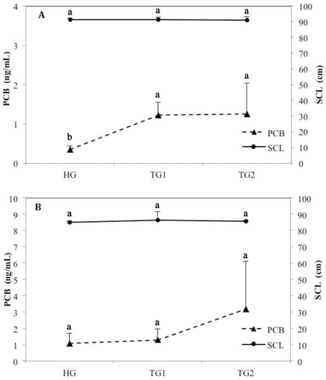 According to the SCL, female turtles of different ages were divided into two groups. Table 2 shows the PCBs concentrations measured in the green turtles included the younger group (YG, n = 13) and the older group (OG, n = 11). The total PCBs concentrations are inversely related to the SCL. YG (mean 88.7 cm) contained higher total PCBs concentration (0.52 ng/mL), while OG (mean 94.1 cm) contained 0.15 ng/mL of PCBs, significantly lower than YG (p < 0.05). The result was consistent with a previous study that had showed that PCBs concentration decreased with increasing SCL in the Hawaiian green sea turtle, but without eliminating the effects of sex and age ratios in turtle samples [].