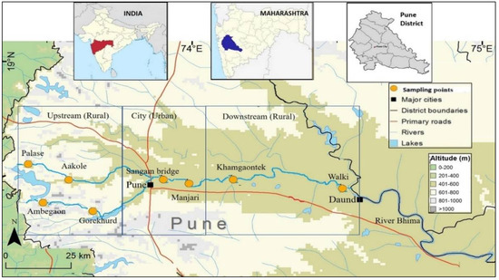 Eight sampling sites along the Mula-Mutha river were selected, covering the whole length of the river including upstream, confluence and downstream locales with respect to Pune city. Of the eight sampling points, six were from rural and two were from urban Pune (Figure 1). The distance between sampling points ranged from 5–40 km. Three water samples per site were collected over a period of 1 year. The samples were collected three times over a period of 1 year: during post-monsoon (January 2016), pre-monsoon (May 2016) and monsoon (August 2016). Approximately 400 mL river water was collected in previously autoclaved 500 mL polypropylene bottles from 60 cm beneath the river surface. These bottles were immediately kept on ice and transported to the laboratory in Mumbai (6–8 h) on the same day, stored overnight between 4–8 °C, and bacteriological analysis was undertaken on the following day [41]. Bacterial analysis of the water samples was carried out as per the specifications given by the Bureau of Indian Standards [42].