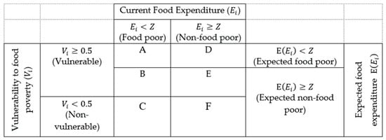Following Maeda and Tscherning [], Ward [], and Azeem et al. [], Figure 1 shows the categorization of food poverty and vulnerability, which helped to investigate the various manifestations of current poverty, future expected poverty, and current vulnerability status. Six overlapping categories (A to F) of individuals were grouped in Figure 1, based on their current food expenditure (), expected food expenditure , and vulnerability to food poverty . In this figure, the currently food poor individuals (those individuals whose current food expenditure lay below the food poverty line) were represented by area A + B + C, while the non-food poor individuals were denoted by area D + E + F. The current food poor individuals were further decomposed into those that were chronically or structurally food poor, as represented by area A, and those that were transient food poor, as represented by area B + C. The chronically food poor individuals were those who were currently food poor, and their structural characteristics suggested that they were also expected to be poor, while the transient food poor individuals were those who were currently food poor, but not expected to be poor. The non-food poor individuals were classified as high vulnerable non-food poor (HVNP) and low vulnerable non-food poor (LVNP), which are show in Figure 1 as areas D + E and F, respectively. Vulnerable individuals—individuals whose probability of falling below the food poverty line was greater than our vulnerability threshold of 0.5—were denoted by area A + B + D + E. These individuals could be classified as those who were vulnerable because of low expected food expenditure (LEE, area A + D) and those who were vulnerable because of highly variable food expenditure (HVE, area B + E).