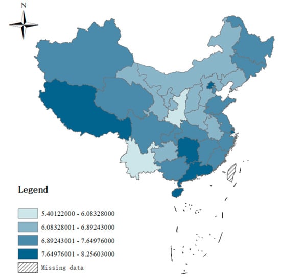 Applying a 2530 kilocalorie constraint in the linear programming, the food poverty line for each province was calculated. The distribution of the food poverty line across the whole country is shown in Figure 2, with the lowest food poverty line of 5.4 yuan/day in Shaanxi Province and the highest poverty line of 8.25 yuan/day in Shanghai. The average food poverty line of the whole country was 7.2 yuan/day. Figure 2 indicates that the central area had lower food poverty lines than the other parts of the country.