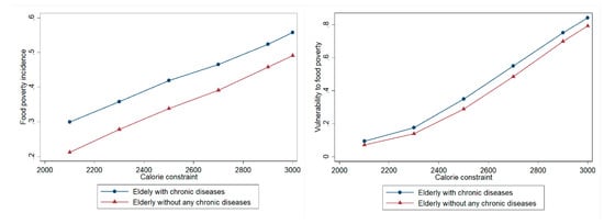 To have more confidence in the estimation results, a series of robust checks were incorporated. The first concern was given to the subjective 2530 kilocalories constraint in the estimation of food poverty lines. We created six adult equivalence per day calorie constraints, ranging from 2000 kilocalories to 3000 kilocalories, which gave us six least cost food expenditures. Applying these least-cost expenditures as food poverty lines, Figure 3 gives the food poverty incidence and vulnerability to food poverty for both the elderly with chronic diseases and those without any chronic diseases. The results showed that the distribution of vulnerability and food poverty between different groups was robust: the elderly with chronic diseases experienced higher food poverty incidence and were more vulnerable to food poverty for all adult equivalence per day calorie constraints than the elderly without any chronic diseases. However, the magnitude of food poverty incidence and vulnerability estimates were sensitive to the choice of calorie constraint, and with a higher calorie constraint, the magnitude of food poverty incidence and vulnerability estimates were larger for both population groups.