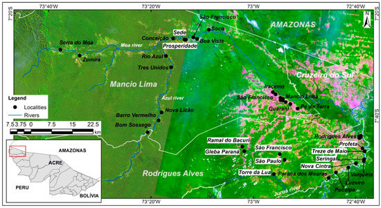 The study area comprises the municipalities of Mâncio Lima (ML) and Rodrigues Alves (RA) located in the northwest Acre state, Brazil (Figure 1). ML and RA belong to the Alto Juruá region, where currently 90% of Acre’s malaria cases are concentrated [23]. The last demographic census [30] counted 15,206 inhabitants in ML, of which 8750 live in urban areas (57.5%), and 14,389 inhabitants in RA, with 4315 residents in urban areas (29.98%). Agriculture and cattle raising are the primary economic activity of the two municipalities, making up more than 55% of the Gross Domestic Product (GDP) [31].