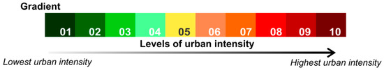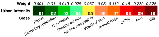 Following the methodology defined by Dal’Asta [36], a weight value reflecting urban intensity was associated to each class of land use and cover (Figure 2). These weight values were obtained from pairwise comparison method, developed by Saaty [37] for the Analytic Hierarchy Process (AHP), based on the relative importance of each class for the urbanization process (Figure 2). Classes from 06 to 10 received higher weight values because they more directly represent spaces of reproduction of urban life, while classes from 01 to 05 are classes of land cover, from which land use is inferred, representing objects of lower intensities in the gradient. The “Forest” class received the value of 0.001, which although low, is a value different from zero, due to the possibility of use, for example by extractivism. For every locality buffer (objects), the percentage of each land use and cover class was multiplied by its respective weight and then summed in order to obtain an urban intensity value per object. Thus, each locality can be positioned in a simplified gradient represented by 10 reference points (levels) of urban intensity (Figure 3) that establish a relation with the reference system (Figure 2).