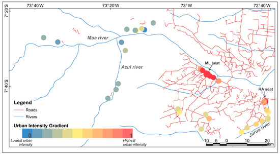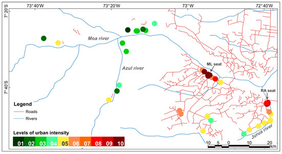 In general, the results reveal an urban-rural gradient in the study area from the municipal seats, passing through the localities along the road networks and ending at the riverine localities. Figure 4 shows the classification of the localities according to their spatial forms (system of objects). In Figure 4, the local urban reference, the ML seat, is seen as part of a cluster of localities classified from high to intermediate intensity (levels 5 to 10). There is a secondary urban cluster centered at the RA seat (longitude 72°40′ W) that extends southward along the Juruá River, where there are five localities classified at intermediate levels of intensity (levels 4 and 5). There is a set of five localities accessible by dirty roads also classified as intermediate levels of intensity (levels 4 to 6). At the left side of the map, one finds the less urbanized localities, a set of 13 localities only accessible by river, which were classified in the lower levels of intensity (levels up to 4).