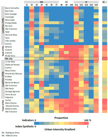 A Synthetic Index (SI) was constructed to form an urban intensity gradient for the system of values. In this gradient, the urban intensities are represented on a scale of 0 to 1, and the closer to 1 the more “similar” the place is to the behavior observed in ML. To compute the SI, the distances of each indicator were summed and the result linearly normalized (Equation (2)):