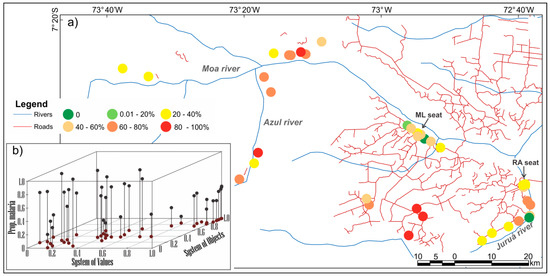 From these results, the urban phenomenon and its values are shown to be widespread in the territory, along a gradient. Similarly, malaria occurrence also reveals a complex spatial distribution with respect to its exposure and risks. Along with this urban gradient, malaria occurs with different intensities. The distribution of percentages of malaria-positive households (defined as at least one resident with malaria in the last 12 months) by locality in the year of the household survey, is shown in Figure 8a. Malaria occurs independently of the rural or urban situation of the households, although there are more positive households in the road settlements and riverine localities. Figure 8b shows the behavior of each locality in the system of object and values in relation to malaria. According to Figure 8b, there is an increased trend of positive households in places with low to medium urban intensities. In addition, localities with high urban intensities present low to intermediate patterns of malaria occurrence and intermediate levels of malaria occurrence are also associated with intermediate urban intensities. In other words, there are complex patterns of association between the occurrence of malaria and the urbanization of the territory in the study area which are imperceptible in dichotomous representations.