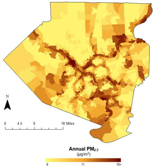 PM2.5 estimates for Allegheny County were acquired from research conducted at Carnegie Mellon University (CMU) [15]. PM2.5 measurements were gathered in the summer (August) of 2013 and winter (December to January) of 2013–2014 from 36 monitor sites, and annual levels across the county were determined using a Land Use Regression (LUR) model as developed in the ESCAPE project [16]. The spatial distribution of annual PM2.5 concentrations is shown in Figure 1.