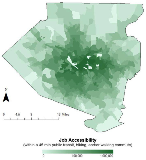 Job accessibility has been measured in many ways in past research, including job density and distance from home locations [36]. In the present analysis job accessibility was measured through a mobility index defined as the average number of jobs available within a specified commute time [37]. This method allows measurements to cover various transportation methods, and provides estimates that are more realistic than simple measures of density or distance—which are meaningless if individuals have poor transportation options. In fact, it is typically low-income populations that have the lowest mobility levels and endure the longest commute times, which can result in a wide array of health and social burdens [38,39,40]. Improving mobility for disadvantaged populations thus has immense potential to improve their health and wellbeing.