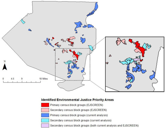 The following are available online at http://www.mdpi.com/1660-4601/15/6/1260/s1, Table S1: Primary block groups identified by EJSCREEN as environmental justice priority areas, Table S2: Secondary block groups identified by EJSCREEN as environmental justice priority areas, Table S3: Primary block groups identified in the present study as environmental justice priority areas, Table S4: Secondary block groups identified in the present study as environmental justice priority areas.