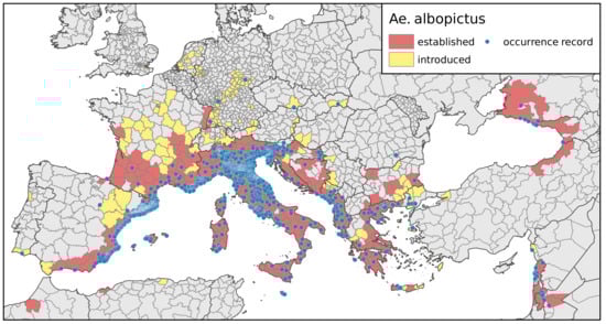 European distribution of Aedes albopictus as of January 2018. Blue dots: high-precision occurrence records derived from the literature and used for modelling (n = 1336). Red and yellow areas: administrative units with established populations and introduced specimens, respectively, according to the European Centre for Disease Prevention and Control []. Areas are level-3 administrational units following the nomenclature des unités territoriales statistiques (nomenclature of territorial units for statistics, NUTS) as used by the European Union. For Germany, this corresponds to the district (Kreis) level.