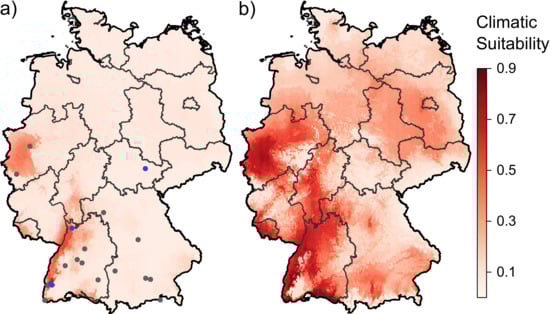 (a) Relative climatic suitability for the establishment of Aedes albopictus in Germany. Circles: high-precision occurrence records derived from the literature for both single introduction events (grey) and established (overwintering) populations (blue); only the latter were used for modelling. (b) Projected future suitable climates for the establishment of Aedes albopictus in Germany (near future 2021–2040, climate model mpi-esm-lr, climate scenario RCP 8.5). (a,b) global climatic dataset worldclim with spatial resolution of 2.5 arcmin (≈5 km). Lines delineate level-2 administrational units (federal states) of Germany.