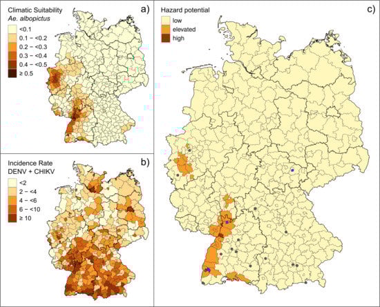 The following are available online at http://www.mdpi.com/1660-4601/15/6/1270/s1, Table S1: Current climatic suitability for the establishment of Aedes albopictus in Germany, incidence of travel-associated CHIKV and DENV infections (cases per 100,000 population over the years 2011–2017), and hazard potential classes at the county level, Figure S1: Map of Germany with geographical units (federal states, counties, cities and mountain ranges) mentioned in the main text, Figure S2: Overview about the current situation regarding Aedes albopictus in Germany.
