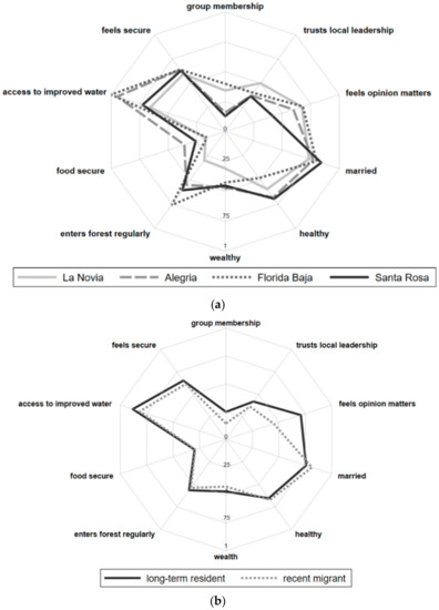 There were no significant differences in SWB Happy Ladder scores among the four communities (p = 0.315), and no differences in people’s sense of security or reported presence of health problems in the past year. There were differences in community social group membership, with more community group participation in Florida Baja and La Novia, (p < 0.001, χ2 test), more food security in Alegria (p < 0.001, χ2 test), greater access to improved water sources in Alegria and Florida Baja (p < 0.001, χ2 test), and lower wealth scores in La Novia (p < 0.001, χ2 test). (Figure 1).