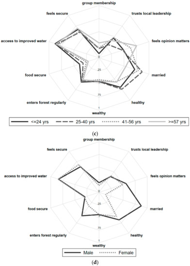 Spider plots of key variables by community. (a) key factors by community; (b) key factors by migration status (years in community); (c) key factors by age of head of household; (d) key factors by sex of head of household.