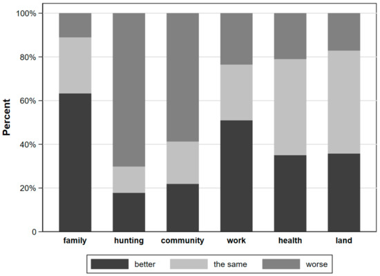 There were both similarities and differences in the themes that emerged in the qualitative and quantitative results. Based on data from the surveys, since the IOH construction, 63.3% of long-term residents felt that their lives had improved, 25.6% of long-term residents felt that life was the same, and only 11.1% felt that it had gotten worse (Figure 2). The major themes that came up during the qualitative FGDs and KIIs regarding the impact of the IOH on their well-being related to changes in specific components of social capital (specifically, migration), human capital (i.e., health), and physical capital (i.e., environmental change). These are described below along with quotations to support our findings.