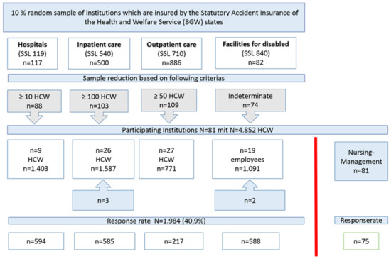 This cross-sectional study was conducted in 2017. A 10% random sample was taken of workplaces in the four categories of hospitals, inpatient and outpatient geriatric care and facilities for people with disabilities, which are insured by the Statutory Accident Insurance of the Health and Welfare Service (BGW) and come from four different German states (Bavaria, Berlin, Mecklenburg-Western Pomerania, and North Rhine-Westphalia). This resulted in a total of 1585 facilities. To reduce the sample, a minimum number of employees was defined for the respective industry, (Figure 1) leaving 374 institutions that were then contacted and invited to participate.