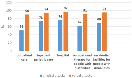The study by Groenewold et al. [18] from the US also determined an increase in violent attacks between 2012 and 2015: the incidence rate in participating hospitals increased from 4.4/1000 full-time employees to 7.7/1000 between 2012 and 2014, while the rate was 7.2% in 2015. In our study, the employees at hospitals (97%) and residential facilities for people with disabilities (95%) were most affected by verbal abuse, followed by employees working in inpatient geriatric care (94%). Physical violence was most commonly experienced by staff at hospitals and in inpatient geriatric care.