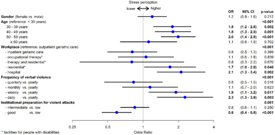 Women feel under higher stress, although this result is not statistically significant. Compared to younger employees, the risk for high stress perception increases with age (Figure 2). For employees aged over 60, the stress perception decreases again. The more frequently employees are exposed to verbal abuse, the more stressed they feel. Where verbal abuse is experienced on a daily basis, the OR rises to 2.3 (95% CI 1.3–39). The experience of physical violence and the participation in de-escalation training had no influence on stress perception. Where the institution provided good preparation for such events, the employees’ stress perception decreased (OR 0.6, 95% CI 0.4–0.8) (Figure 3).