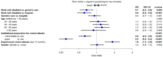 With regard to the psychological requirements of their job, 70.2% of participants evaluated their work capacity as good to very good. Furthermore, 79.5% believed that they would still be able to do their job in two years’ time. 89.3% had only occasionally or never thought about giving up their job. Risk factors for decreased work capacity are experiencing violent attacks (OR 1.8, 95% CI 1.4–2.5) and increasing age. However, preparation for possible violent attacks appears to have a protective effect (OR 0.3, 95% CI 0.2–0.4). Working with people with disabilities also has a protective effect on work capacity as compared with working in geriatric care or in hospitals (Figure 4).