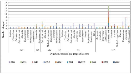 The AMRS were based on 18 organisms (genus), with species or serovars appearing at least once (Figure 1). The organisms’ appearance, in descending order, were: Escherichia coli, Salmonella, Staphylococcus, Pseudomonas, Klebsiella, Bacillus, Enterococcus, Proteus, Vibrio, Listeria, streptococcus, Citrobacter, Aerobacter, Clostridium, Enterobacter, Micrococcus, and Serratia (Figure 1). The distribution of the organisms studied yearly at geopolitical zones demonstrated some organisms were studied more in particular regions or geopolitical zones of Nigeria (Figure 2).