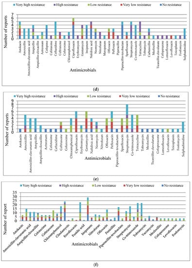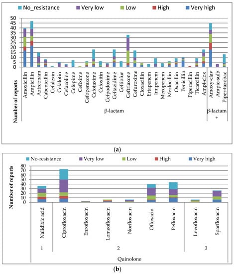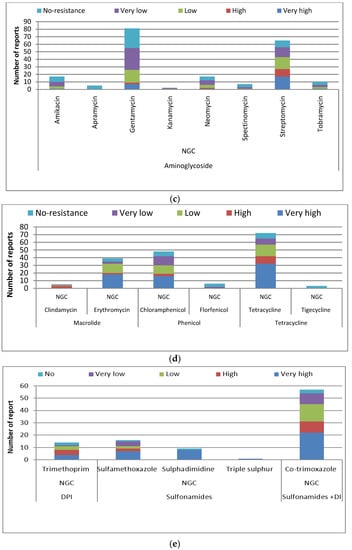 Number of reports of antimicrobial resistance levels of (a) β-lactam derivatives; (b) Quinolones, (c) Aminiglycosides; (d) Macrolides, Phenicols, and Tetracyclines; and (e) Sulfonamides derivatives antimicrobials.