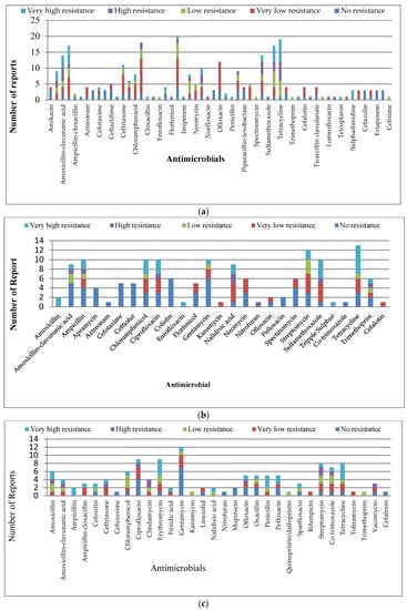 Antimicrobial resistance within the generational classification of antibiotics used in AMRS (Table 3) revealed that the 68 antibiotics used in all 42 studies involved first, second, third, and fourth generations, and NGC. The generational classification (Table 3) was done using the WHO and the World Organization for Animal Health (OIE) lists of critically important antimicrobial in humans and animals [74,75,76]. This classification is, essentially, based on the spectrum of activity, which increased from first to fourth generation, implying narrow to broad coverage of antibiotics’ action [74]. Cumulatively, of the 1139 antimicrobial report findings, the NGC had the highest number of reports of 537 in the studies of different resistance levels, followed by second and third generation at 210 and 205 reports, respectively; then, fourth generation at 100 and first generation at 86 reports of the resistance findings (Table 3, Figure S4a). The pattern of resistance (Figure S4b) based on proportional percentages of reports showed about 30% of reports on third and fourth generation, and NGC antimicrobials; 20% of first and second generation had very high levels of resistance. It was only 30% of the reports on first, second, and fourth generation, then 20% of third and NGC antimicrobials that had no resistance (Table 3, Figure S4b).
