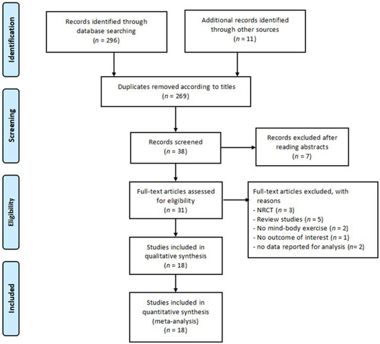 Figure 1 shows the procedures of study selection. The electronic and manual searches resulted in 307 articles. Based on the titles of initially identified articles, there were 269 duplicates and therefore they were removed. After removing the 269 duplicates, 38 studies remained for screening. After reading abstract of the remaining 38 articles, seven irrelevant records were excluded. Based on the eligibility criteria, 13 studies were removed because they were either not RCTs (n = 3), were review studies (n = 5), had no MBM intervention (n = 2), provided no outcome of interest (n = 1), or had no data reported for analysis (n = 1).This left only 18 eligible RCTs to be included for the meta-analysis.