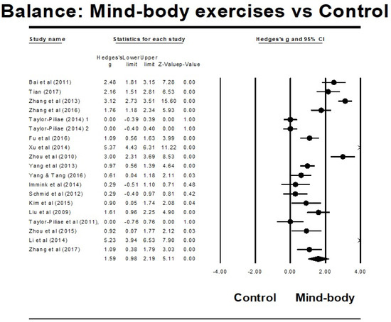 Objective: We performed a systematic review with meta-analysis and meta-regression to determine if mind–body movements (MBM) could be effective in rehabilitating balance function among stroke survivors. Methods: A literature search was conducted using major Chinese and English electronic databases from an inception until January 2018. Randomized controlled studies were included in our meta-analysis. Data was independently extracted by two review authors using a pre-developed table and confirmed by a third party to reach a consensus. Pooled effect size (Hedge’s g) was computed while the random-effect model was set. Results: The meta-analytic results showed a significant benefit of the MBM intervention on increased balance function compared to the control groups (Hedge’s g = 1.59, CI 0.98 to 2.19, p < 0.001, I2 = 94.95%). Additionally, the meta-regression indicated that the total number of sessions (β = 0.00142, 95% CI 0.0039 to 0.0244, p = 0.0067) and dose of weekly training (β = 0.00776, 95% CI 0.00579 to 0.00972, p = 0.00) had significantly positive effects on balance function. Conclusions: The study encouraging findings indicate the rehabilitative effect of a MBM intervention for balance function in stroke survivors. However, there were significant limitations in the design among several of the included trials. Additional studies with more robust methodologies are needed to provide a more definitive conclusion.