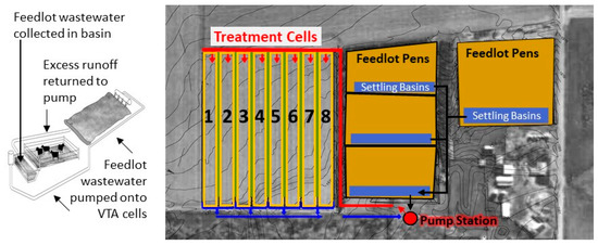 Following a rainfall event, the runoff from the feedlot pens was collected in unlined settling basins at the bottom of each pen. Cattle were excluded from the basins by fencing. After allowing solids to settle for 24–48 h, the feedlot wastewater was channeled into the pumping station, for distribution onto the VTAs. Rain that fell on the grassy VTA cells, but that did not infiltrate into the soil, was collected at the bottom of the VTA cells. After collection of the rainfall runoff, valves at the bottom of the VTA were opened, allowing the VTA rainwater runoff to also drain into the pumping station.