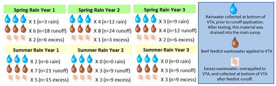 In order to evaluate the efficacy of the VTS and the dynamics of runoff-associated antibiotic resistant bacteria and antibiotic resistance genes (ARB/G), samples were collected following individual spring and summer rainfall events, for three consecutive years, for a total of six collection time points (Figure 2). The original design included fall rainfall collection as well, but for the three years of the study, no fall rainfall events occurred that were large enough to require VTA application. Three types of samples were collected: rainfall runoff, feedlot runoff, and excess runoff. Rainfall runoff consisted of rain that had fallen on the VTA cells, but that did not infiltrate into the soil. VTA cells were paired (see Figure 1), and rainfall runoff was pooled for sets of two cells. The ARB/G in the VTA rainfall runoff represent organisms and genes that were still available for transport since the previous feedlot runoff application. Feedlot wastewater consisted of material that collected in the settling basins following a rain event. It included cattle manure and feedlot surface material particles suspended in the rainwater. Excess wastewater consisted of feedlot runoff that had been applied at the top of the VTA, and that was collected at the bottom of the VTA. Under normal operation, there was no excess wastewater. The VTA was usually managed so that only the amount of feedlot wastewater that could infiltrate the soil was applied to each VTA cell. For these experiments, feedlot wastewater was deliberately overapplied, so that we could evaluate the potential of the VTA as a mitigation for ARB/G.
