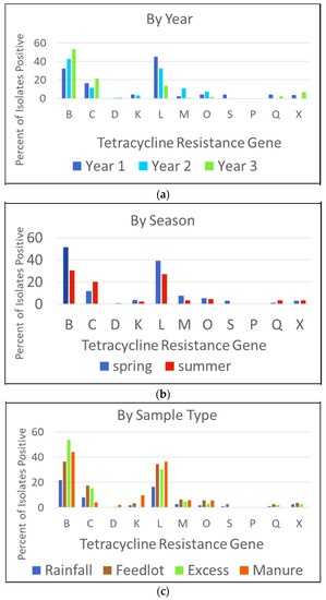 Prevalence of Tetracycline Resistance Genes. (a) By year (n = 822 isolates). (b) By Season (n = 822 isolates). (c) By sample type (n = 822 wastewater isolates and n = 55 manure isolates). Note that x axis letters refer to tetracycline resistance genes.