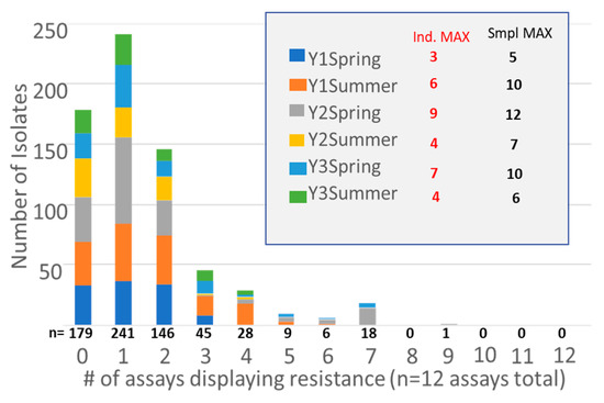 Number of multiple drug resistant (MDR) isolates, based on results of disk diffusion assays for 12 drugs. Bars display number of isolates with the listed number of resistances, 0–12. Total number positive across all sample times is listed directly under each bar. “Ind. MAX” indicates the maximum number of resistances in any one isolate from the given group. “Smpl MAX” indicates the total number of resistances positive for all isolates of the group (Y1Spring isolates displayed resistance to a total of five different drugs). Only samples that fluoresced in EC+MUG (confirmed as E. coli) were stamped for resistance patterns. Up to three isolates were picked per sample and media type.